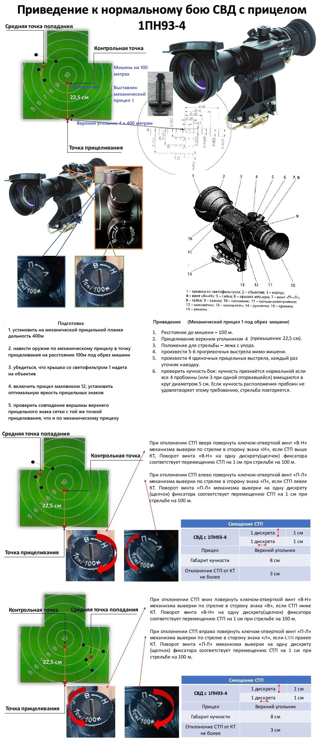 Приведение к нормальному бою СВД с 1ПН93-4Приведение к нормальному бою СВД с 1ПН93-4 ГАБАРИТЫ ПСО-1: 337x136x72 ГАБАРИТЫ 1ПН93-4: 250×190×81 Ниже графически представлена процедура приведения прицела 1ПН93-4 к нормальному бою с винтовкой СВД