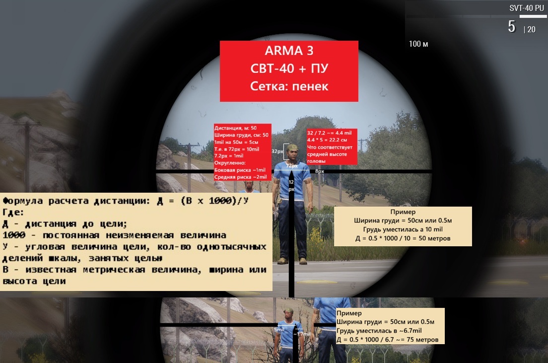 СВТ-40 с ПУ на примере симулятора ARMA 3СВТ-40 с ПУ на примере симулятора ARMA 3 Ниже представлена расшифровка сетки прицела ПУ для СВТ-40 в симуляторе ARMA 3