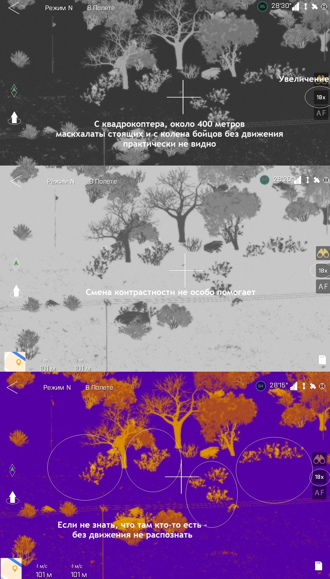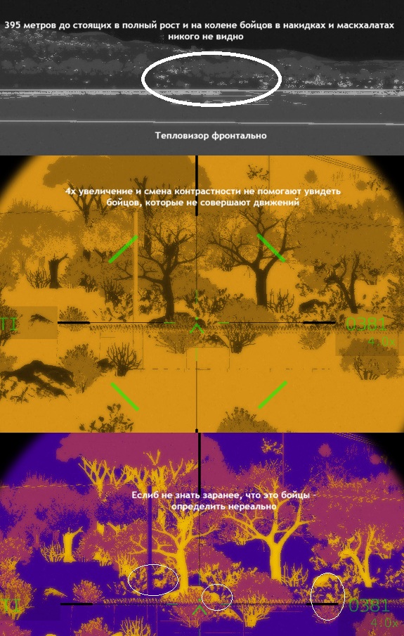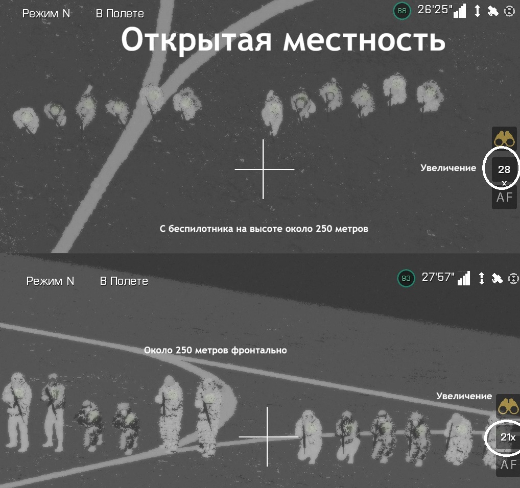 Очень коротенько по теории Маскхалат покупной или самодельный с применением веток с листьями и другими нашитыми предметами отлично размывает силуэт При чем часто используется куртка-накидка с капюшоном с элементами листьев и веток, "половинный гилли" При чем не только обычными глазами, в бинокль или дневной прицел, но и в ночной и тепловизионный прибор Так-же эффективно размывает силуэт с обзора квадрокоптера сверху и под углом Ключевой вывод - отсутствие движения бойца, если боей будет двигаться - увы, даже с боольшого расстояния он заметен Камера мавика имеет хорошее качество картинки и широкий диапазон увеличения, даже небольшое движение в растительности можно уловить Однако, если боец или даже группа присядут в в кустах и деревьях, прекратят движение - оператору даже в тепловизор будет сложно их обнаружить У капюшонов могут быть сетки, скрывающие лицо, которые тоже отлично размывают тепловые сигнатуры Даже простые матерчатые покрытия или накидки на шлем или перчатки на руках двольно неплохо размывают тепловые следы Тепловизор не видит тепловые сигнатуры бойца за стеклом