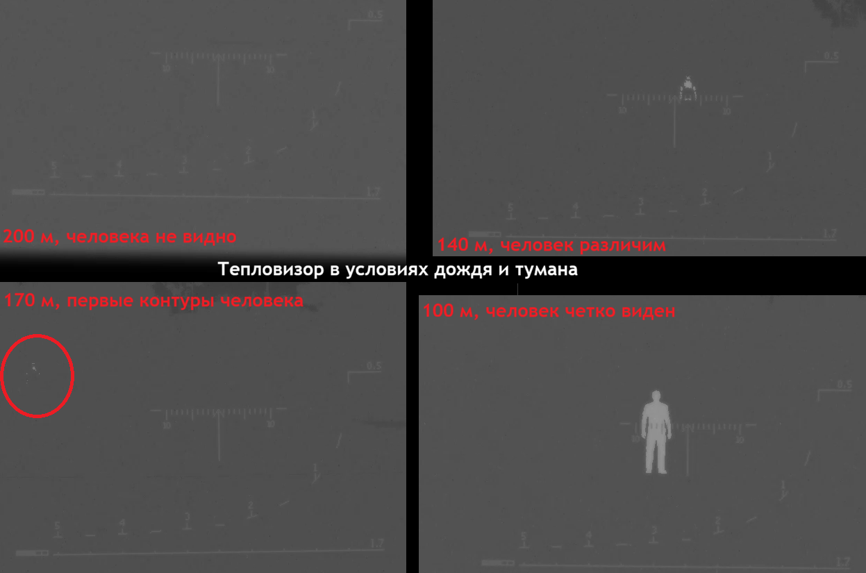 Есть вероятность, что не сможете различить потенциальную цель даже на близкой дистанции Так-же тепловизоры не видят через стекло или изолирующий тепло маскхалат(пока он не нагреется) Ниже приведен пример видимости ТВП Шахин в условиях дождя и тумана на дистанциях 200-100м