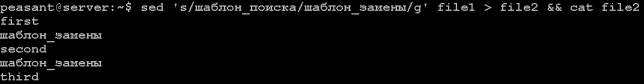 sed 's/шаблон_поиска/шаблон_замены/g' file1 > file2 && cat file2