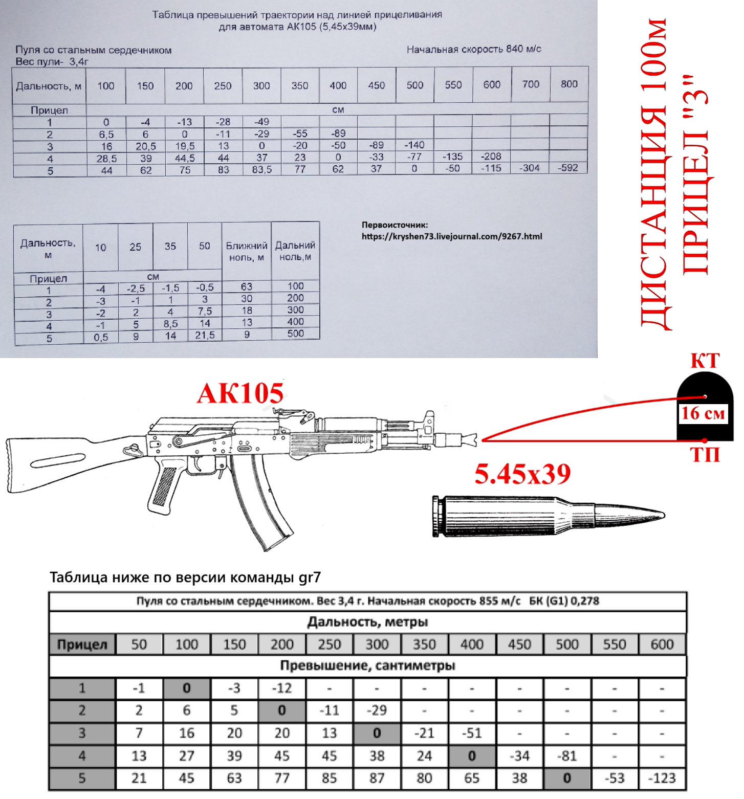 Таблица превышений АК105Таблица превышений АК105 Попытка найти таблицу превышений на примере 100й серии АК по аналогии с АК-74 не увенчалась успехом Выдержка Руководства по эксплуатации автоматов Калашникова АК102, АК104, АК105 (6П44, 6П46, 6П47)" стр. 27 РЭ: