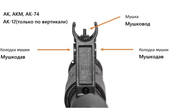 Мушковод по вертикали сместит СТП по высоте: Регулировочный винт целика по горизонтали сместит СТП: