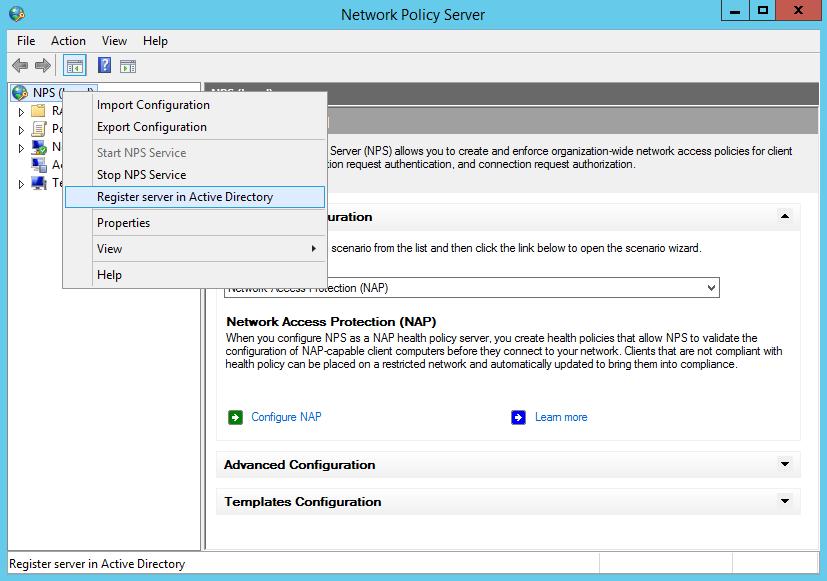Правой кнопкой мыши по "NPS(local)" - Register Server in Active Directory