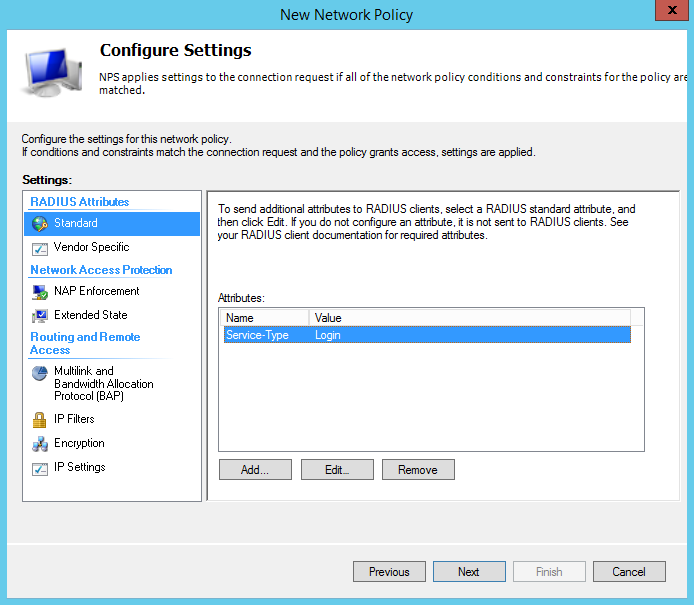 8. Configure Settings, раздел стандартных атрибутов (Radius Attributes Standard):