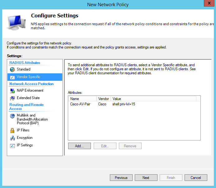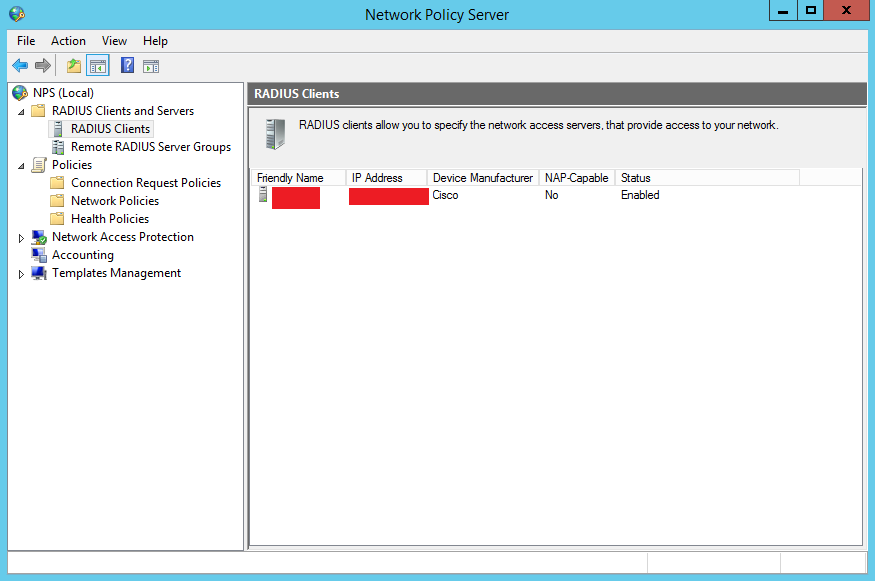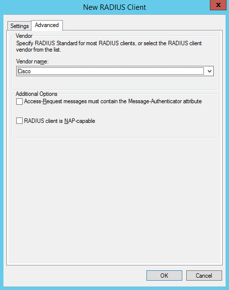 Radius Clients and Servers - Radius Clients - New ( указать имя(Friendly name), IP, ключ(Shared secret), vendor name - cisco )