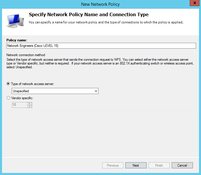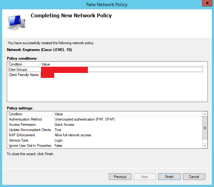 Политика будет применяться к RADIUS клиентам, у которых свойство атрибута "Friendly name" = значение начинающееся с "cisco_"