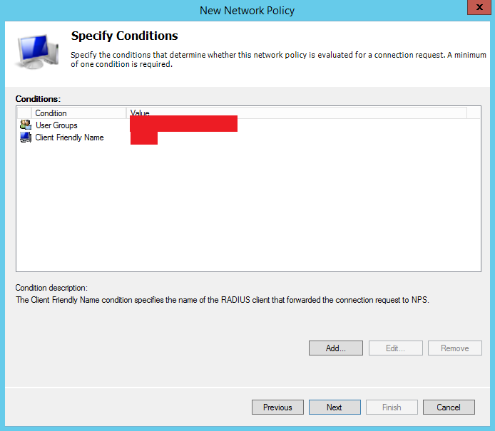 В Specify conditions добавим условия применения политики RADIUS: