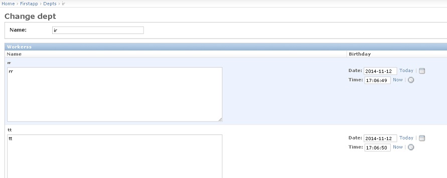 #Добавления связанных объектов (отобразим функционал добавления workers в dept)