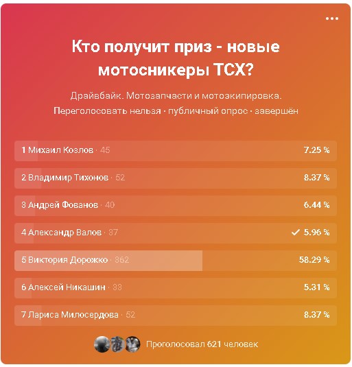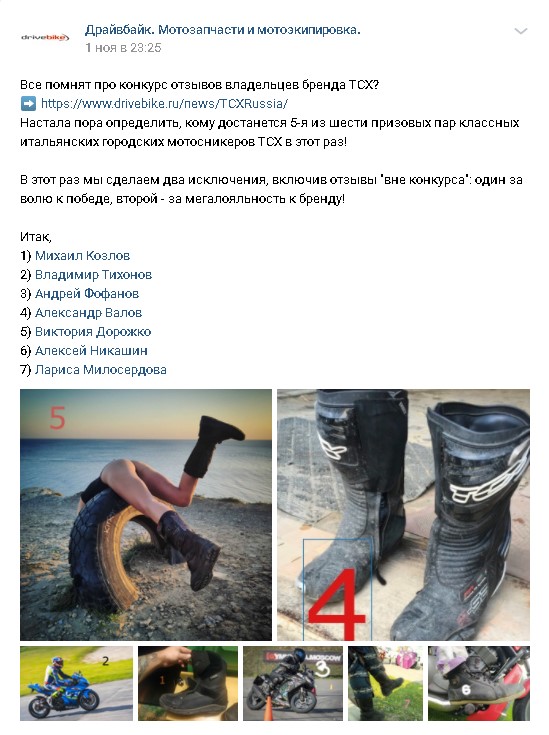 Недавно компания Драйвбайк проводила конкурс отзывов о мотоботах TCX В этом конкурсе были 7 участников Участники оставляли отзывы, Драйвбайк их постил на стене... Вдруг что-то пошли по бороде! Голосовалку за отзывы запустили позже выложенных отзывов, и в самой голосовалке естесственно отзывов не было... Зато было фото женской попы, в итоге конкурс превратился в дроч спермотоксикозников, а реально интересные отзывы пошли по бороде Кстати, конечно субъектив, однако отзыв хозяйки фото с попой естесственно самый краткий и неинформативный из всех Уважаемый Драйвбайк, если уж делаете конкурс отзывов, то и к голосовалке их надо прикладывать Получается, что подавляющее большинство голосовавших этих отзывов не читало Конкурс естесственно превратился сменил тематику "Мотоботы выиграет лучшее фото женского баркаса"