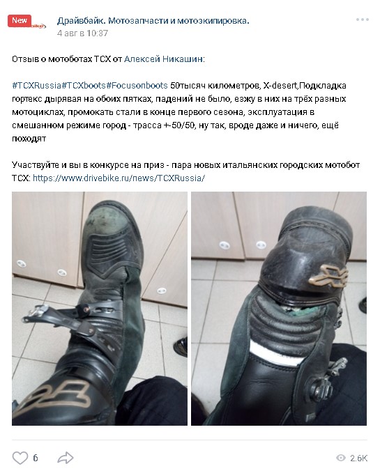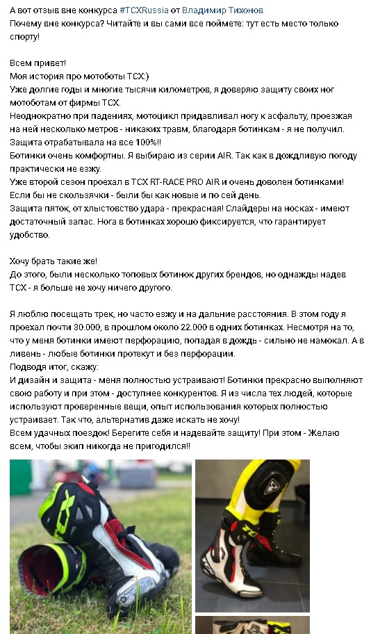 #TCXRussia - новый конкурс от ДрайвБайка и бренда итальянских мотобот ТСХ! 9 января 2020 г. 12:27:36 MSK Идея конкурса: 2020 год - год итальянской мотообуви ТСХ в России! В честь этого каждые 2 месяца ДрайвБайк, официальный представитель бренда ТСХ в России, дарит пару новых городских мо Условия конкурса: Оставь отзыв о своих мотоботах ТСХ Где: На своей странице Вконтакте, Фейсбук, Инстаграм, You Tube Месяц нечетный: собираем отзывы. И так 6 раз. Сколько шансов есть у тебя в этом году? Пробуй!