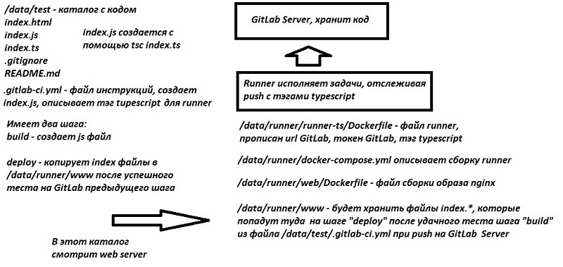 Где: -u - передаётся адрес, на котором живёт GitLab сервер -r - токен регистрации, узнать его можно на странице GitLab -> Settings -> admin/runners --executor объясняет каким образом интерпретировать и запускать команды из .gitlab-ci.yml. В нашем случае обычные шелл команды, значение передали shell --tag-list - в нашем случае — какие фичи поддерживает раннер. У нас установлен только TypeScript, вот его-то я в теги и передал.