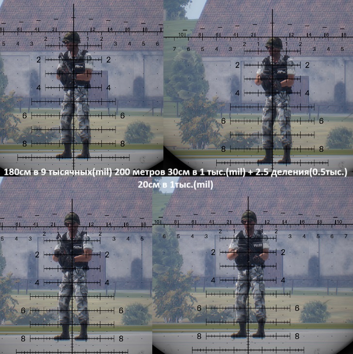 В видео на примере симулятора ARMA 3 рассмотрено определение дистанции по прицельной сетке типа horus h58 h59 на примере 30 сантиметровой головы в каске