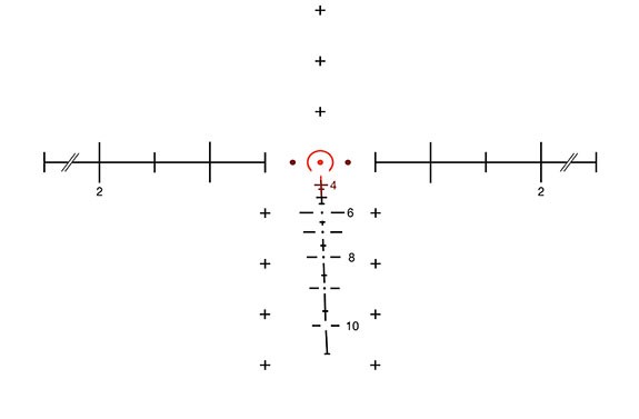 В прицельной сетке ACOG TA11 SDO-CP нижняя часть учитывает смещение вращения пули (деривация) Сетка прицельная: