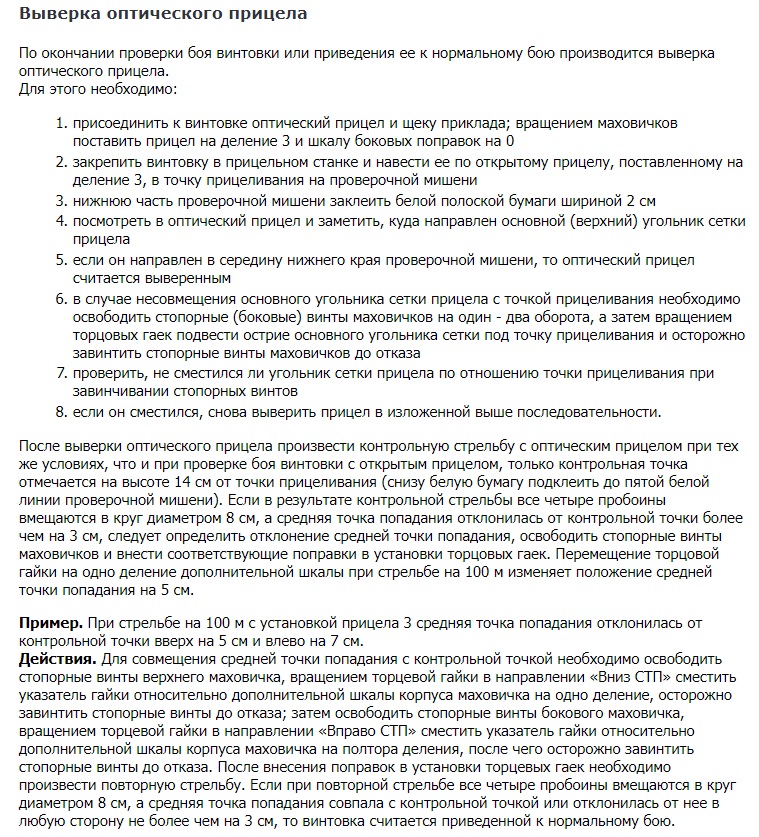 При несовмещении необходимо освободить стопорные винты на 1-2 оборота Произвести контрольную стрельбу при тех же условиях, что и с механическим прицелом Если СТП отклоняется более чем на 3 см - внести поправки в установке торцевых гаек