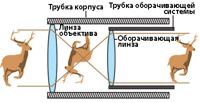 Оборачивающая система внутри оптического прицелаОборачивающая система внутри оптического прицела Если смотреть в увеличительное стекло, линзу объектива или окуляра оптического прицела, то изображение будет перевернутым Для представления картинки в "привычном" положении в оптических прицелах устанавливают оборачивающую систему Может состоять из одной или нескольких оптических линз