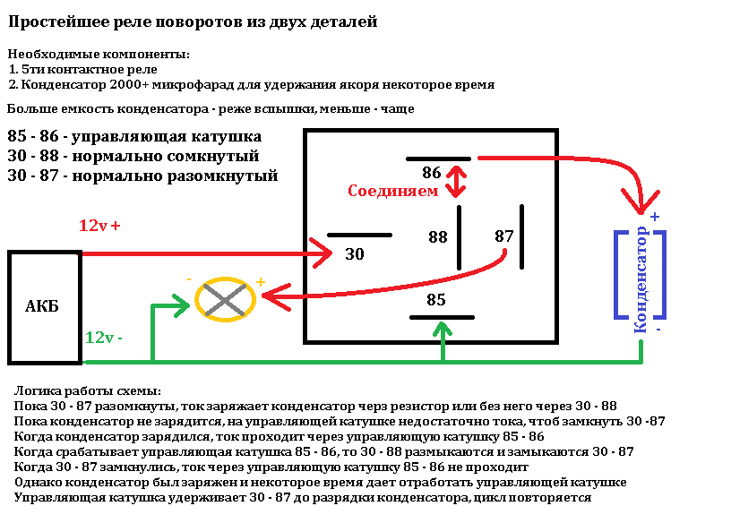 Управляющая катушка удерживает 30 - 87 до разрядки конденсатора, цикл повторяется