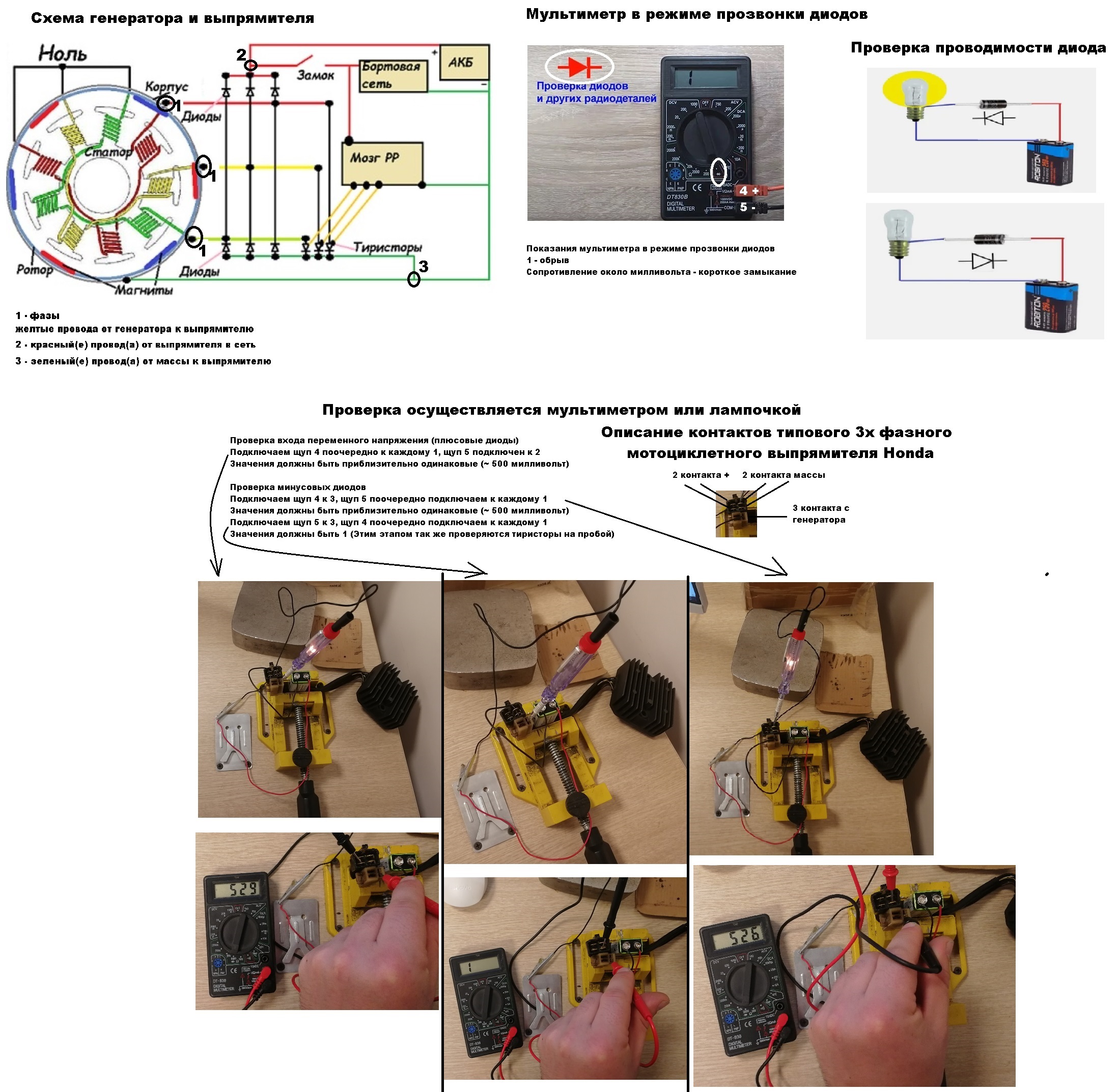 Проведем стандартные проверки диодов в реле регуляторе 3х фазного мотоциклетного выпрямителя Honda