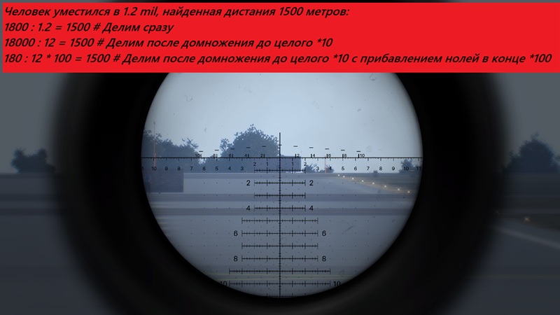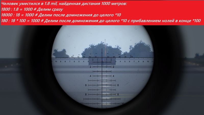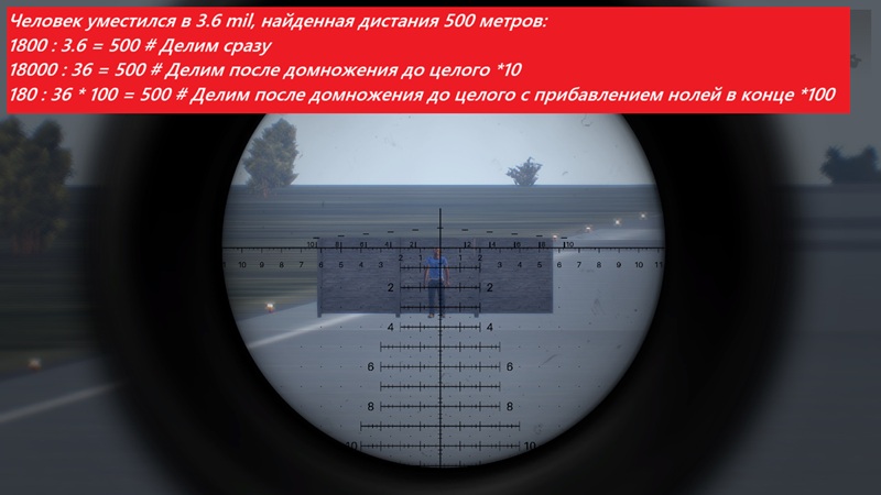 Расчет вертикальных поправок по mil и боковых поправок на ветер по циферблату при стрельбеРасчет вертикальных поправок по mil и боковых поправок на ветер по циферблату при стрельбе Расчет дистанции до цели в mil (тысячных) Формула расчета дистанции до цели по mil: Пример, человек уместился полностью в 3 mil: Шпаргалка с примерами с шагом 0.5 mil: Примеры для 500, 1000, 1500 метров, 3 варианта расчета: Человек уместился в 3.6 mil, найденная дистания 500 метров: