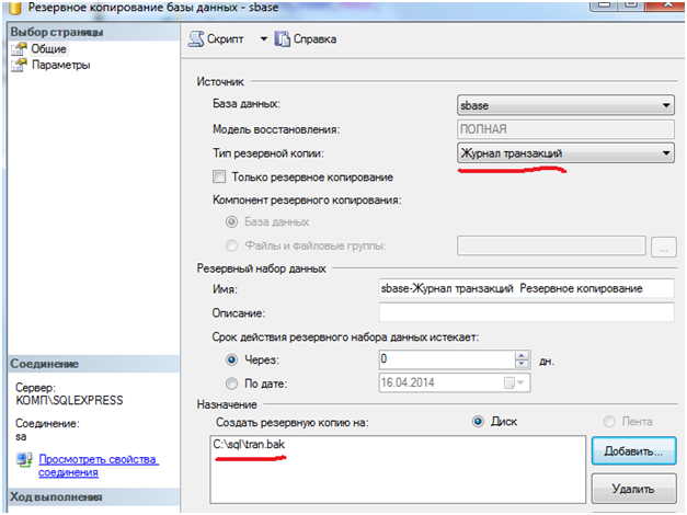 Или с помощью запроса: BACKUP LOG sbase TO DISK = 'C:\sql\sbase_tran.bak'
