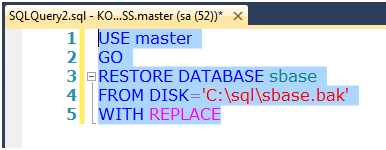 Или с помощью запроса: USE master GO RESTORE DATABASE sbase FROM DISK='C:\sql\sbase.bak' WITH REPLACE