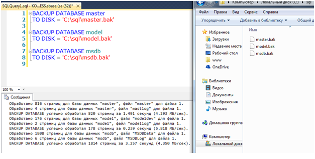 Как видим, на диск ‘C’ было произведено успешное резервное копирование системных баз данных.
