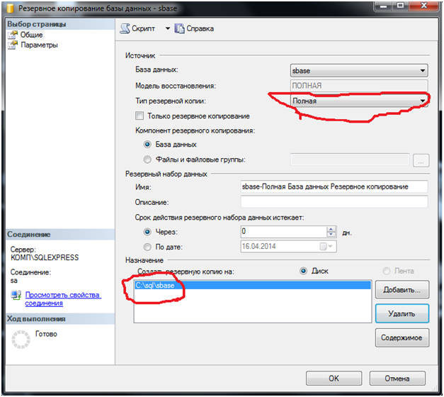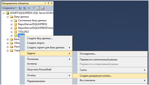 Способ 2(Запрос SQL): BACKUP DATABASE sbase TO DISK = 'C:\sql\sbase.bak'