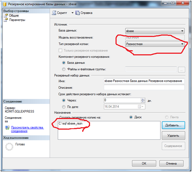 Проведем полный бэкап, добавим еще данных, проведем разностный бэкап: --Делаем полный бэкап BACKUP DATABASE sbase TO DISK = 'C:\sql\sbase_razh2'