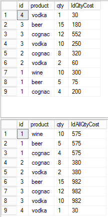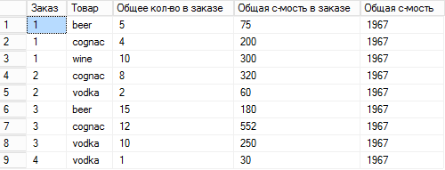 SUM(qty * cost) OVER (PARTITION BY id, product) AS N'Общая с-мость в заказе',