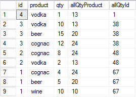SUM(qty) OVER (PARTITION BY product) AS allQtyProduct,