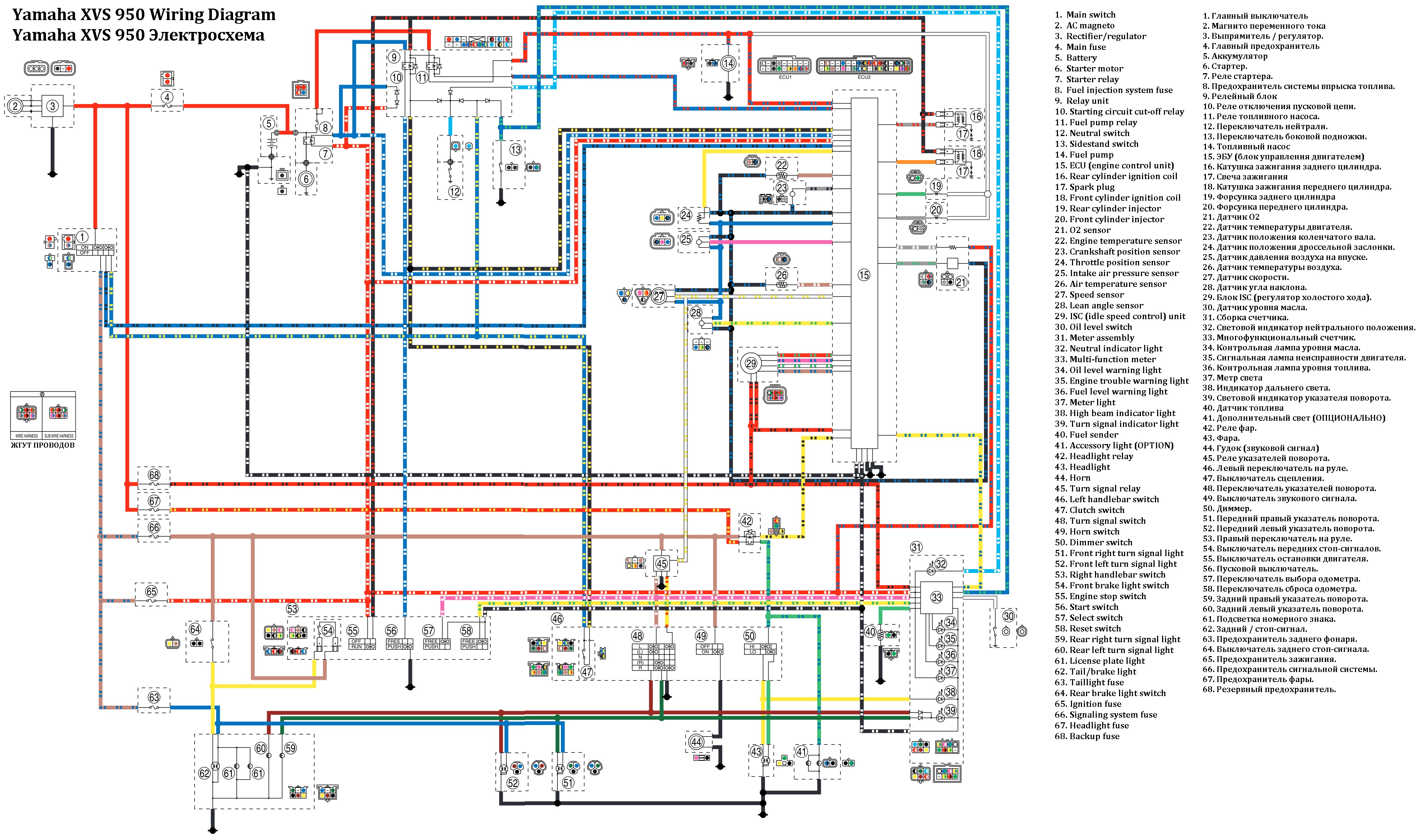 Yamaha XVS 950 Электросхема Wiring DiagramYamaha XVS 950 Электросхема Wiring Diagram В данной статье приведена электросхема мотоцикла Yamaha XVS 950 и скомпонована часть электросхем из траблшутинг и описания компонентов Общая электросхема Yamaha VVS 950