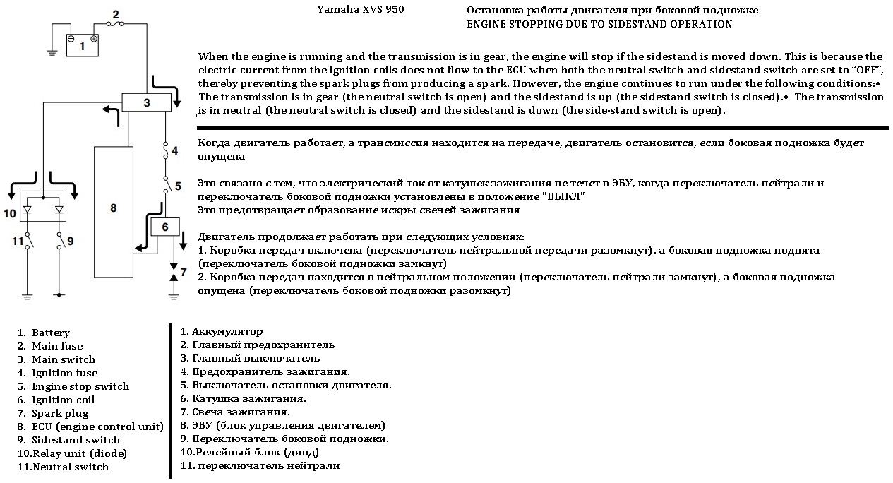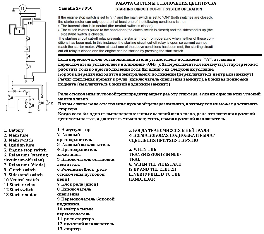 Схема тока при боковой подножке Yamaha XVS 950 Схема тока цепи пуска Yamaha XVS 950